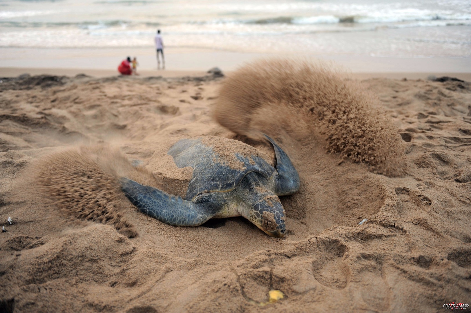 An Olive Ridley turtle digs in the sand to lay its eggs on Rushikulya beach, about 140 kilometres (88 miles) south west of Bhubaneshwar, on early March 17, 2010. Thousands of Olive Ridley sea turtles started to come ashore over the last two days from the Bay of Bengal to lay their eggs on the beach at Rushikulya, one of the three mass nesting sites in the Indian coastal state of Orissa. AFP PHOTO/DESHAKALYAN CHOWDHURY